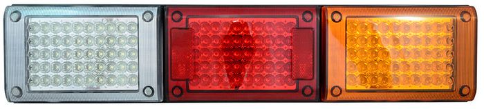 AP10865. White/Red/Amber - Reverse/Stop/Tail/Indicator/Reflector . “Jumbo” style lamp suitable for light commercial, RV, or Truck & Trailer applications. Available in single, double or triple combinations. Multi-volt circuitry. In-built reflectors. 50 LEDs per module.