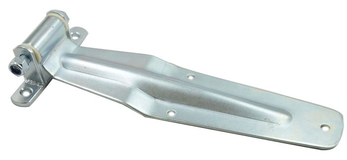 Hinge, Rear Door, Large Extra Long Blade with Bolt On Nylon Bushed Butt and Removable Pin, Pressed Mild Steel Zinc Plated. Overall 345mm long x 87mm wide x 53mm high. Over Seal Fitment. 270 Degree Movement on Hinge.