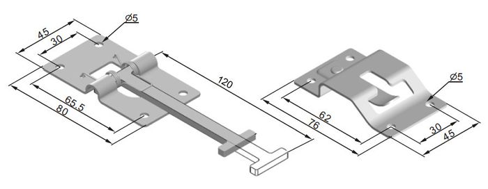 L79.5 x W44.5 x D119mm Hook; Mounting holes 4 ID5mm; Material 304SS; Finish Polished L79.5 x W44.5 x H15.9mm Retainer; Mounting holes 4 ID5mm; Material 304SS; Finish Polished Backing Plates available to suit