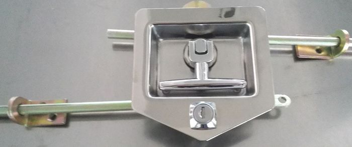 The Folding Drop 'T' handle with concealed fixing studs in Stainless Steel is easily one of Australia's most popular handles for many industrial applications. This unit has a 3 WAY locking system which provides a complete latching system for doors upto 2400mm wide. It makes a secure locking systems that people can use. Handle, key lock, latch and flush recess pan form a self contained unit needing only a simple cut-out. Rods and rod brackets (included) can be attached on site and adjustable for either LH or RH movement. Suits hatches, truck toolboxes and other large enclosures. Keyed 510.